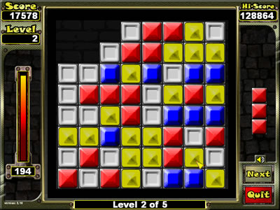 The main objective of Mental Blocks is to score as many points as possible by removing groups of blocks from the field. A group consists of blocks of the same color that are adjacent to each other. When you place your cursor over a group, all members will be highlighted. When you click, they will be removed.
