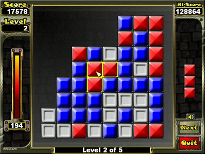 The main objective of Mental Blocks is to score as many points as possible by removing groups of blocks from the field. A group consists of blocks of the same color that are adjacent to each other. When you place your cursor over a group, all members will be highlighted. When you click, they will be removed.